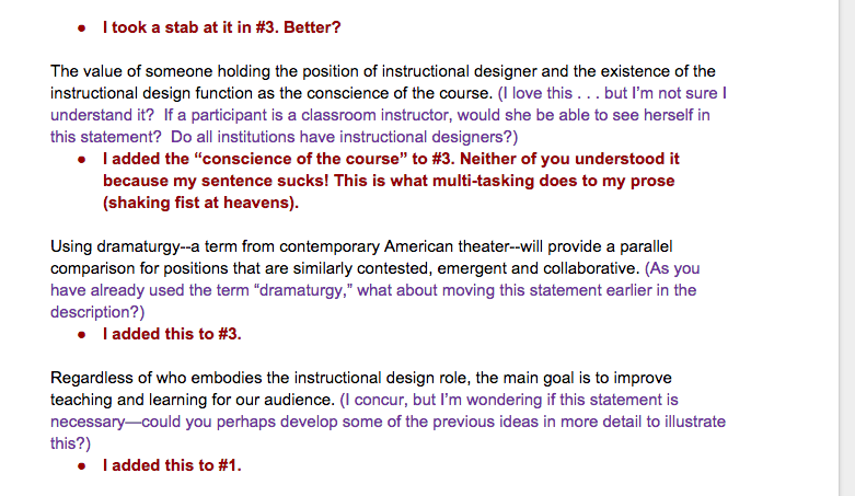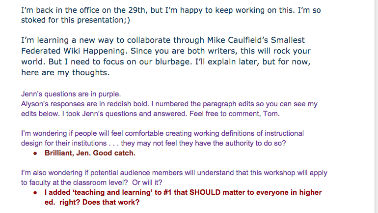 In the example below, she’s purple, I’m red. The black is the original draft.