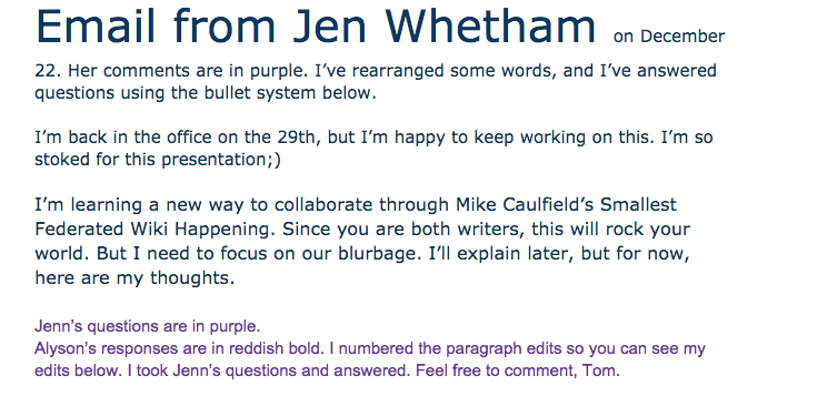 Right now, it’s all about the title and blurbage due date for the marketing materials. Here’s our process. Follow along, and I’ll get to why it’s no small exaggeration when I say that The Smallest Federated Wiki-Happening is changing how I think about writing and collaboration.