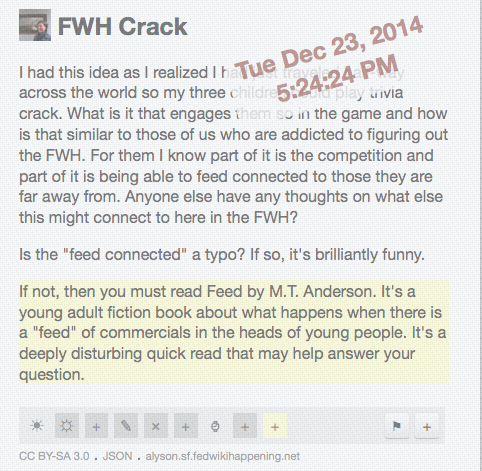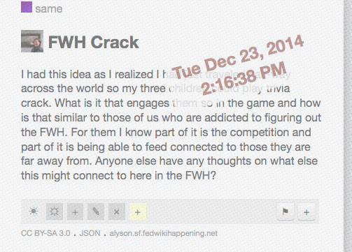Then I hang up the work-related research and log-in to the Mike Caulfield’s Smallest Federated Wiki Happening. I’m feeling pretty brave at this point because I watched Ward Cunningham’s face while Mike was getting all sweet-teacher-praise-like on me during our Google Hangout, and Ward didn’t flinch. He nodded and smiled. My inner-nerd glowed. (Shake & Bake, and I helped! I do a mean US southern accent, btw.)