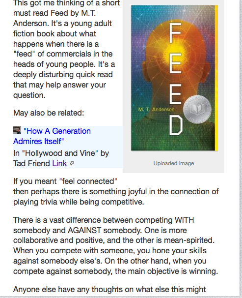 Then I remember the young adult fiction book Feed by M.T. Anderson. Some adults–especially ones who do not have children like me–find reading YA a waste of time. It’s not brainy. There are more important things to read. Leave the creative world of the young to the young, and grow up. So it goes. And I accept that perspective, but that’s not what I’m into. When I hear those rants, I start thinking about my grocery list, but I nod like I’m listening.